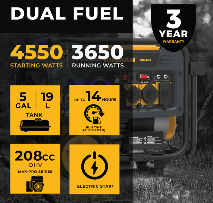 Firman H03651 Dual Fuel 4550W Portable Generator Electric Start 120V
